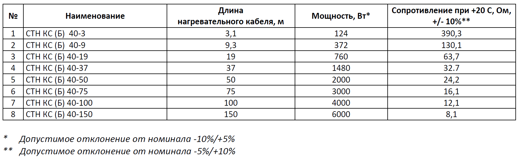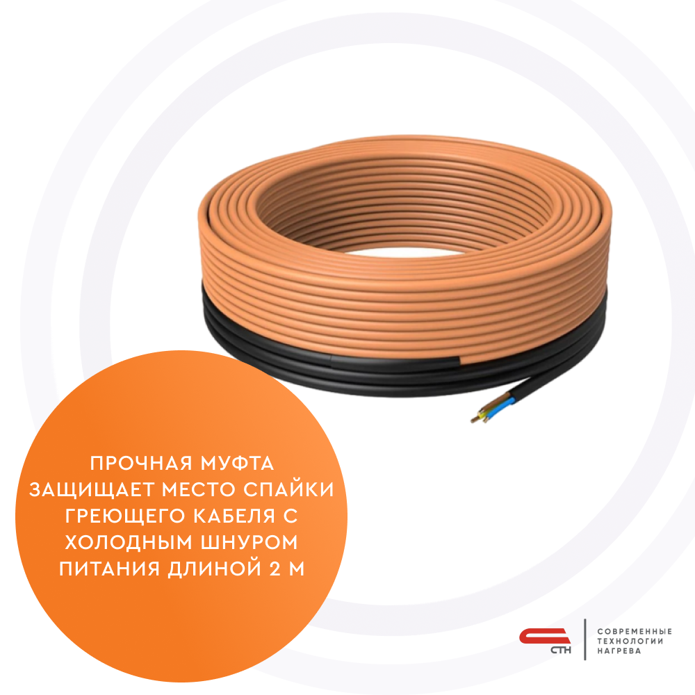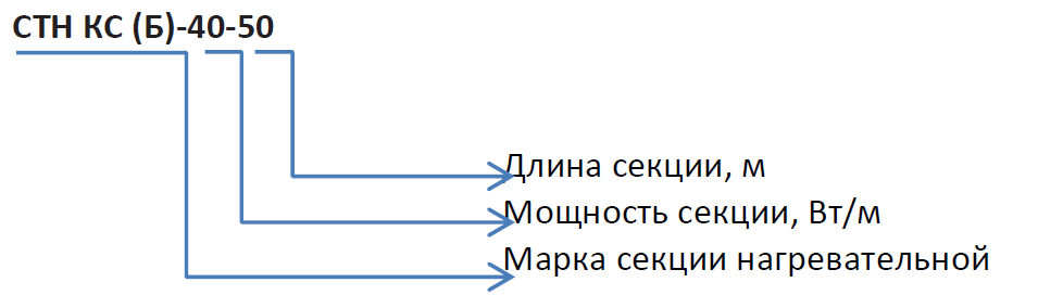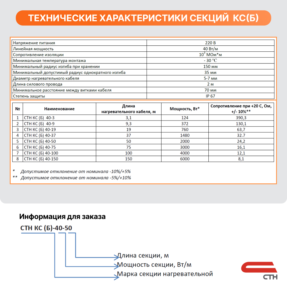 Кабель КС (Б) состоит из металлических нагревательных жил в полимерной изоляции, соединительной и концевой муфт и силовым проводом для подключения к источнику тока. Секции СТН соответствуют требованиям технического регламента таможенного союза «О безопасности низковольтного оборудования» ТР ТС 004/2011. ТУ 3443-008-92573011-2017. Длина кабельной секции составляет 50 м.