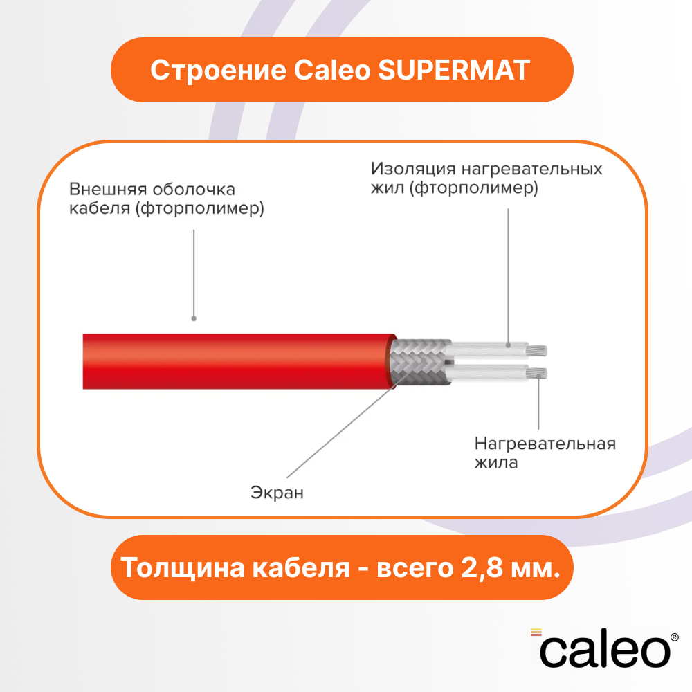 Тонкий греющий кабель (всего 2.8 мм.) позволит избежать подъема всего напольного покрытия, а дополнительное экранирование кабеля обеспечивает безопасность в течении всего периода эксплуатации. Оптимальная площадь обогрева - 3,6 квадратных метров. Гарантия на теплые полы Caleo Supermat составляет 50 лет.
