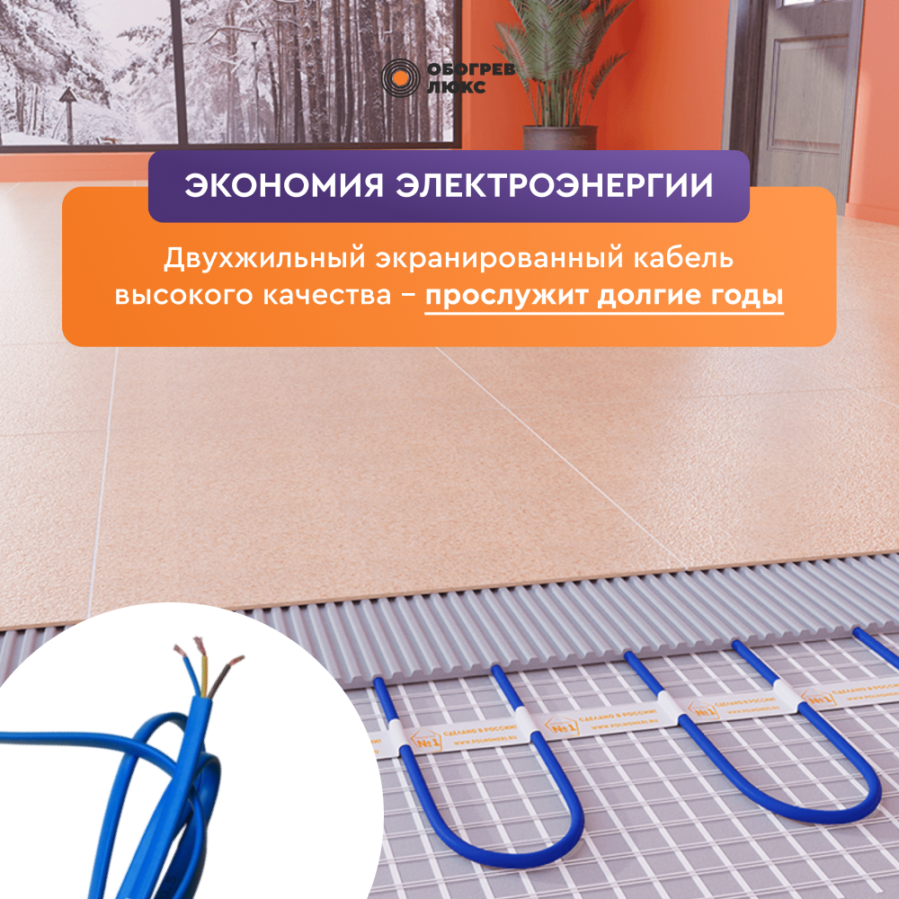 - Тонкий диаметр кабеля позволяет существенно сократить высоту пола, достаточно уложить кабель или мат в слой стяжки 0.5 см;
