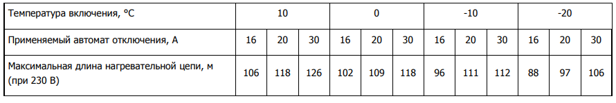 Максимальная длина нагревательной секции нагревательного кабеля xLayder рассчитывается, исходя из температуры включения и типа автоматического выключателя питания: