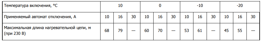 Максимальная длина нагревательной секции нагревательного кабеля xLayder рассчитывается, исходя из температуры включения и типа автоматического выключателя питания: