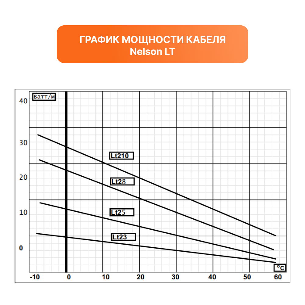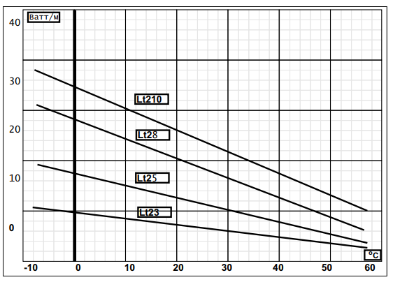 Номинальное тепловыделение в нормированных условиях для саморегулирующихся нагревательных кабелей LT с рабочим напряжением 220В: