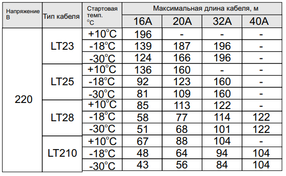 Максимальная длина нагревательной секции нагревательного кабеля LT рассчитывается, исходя из температуры включения и типа автоматического выключателя питания: