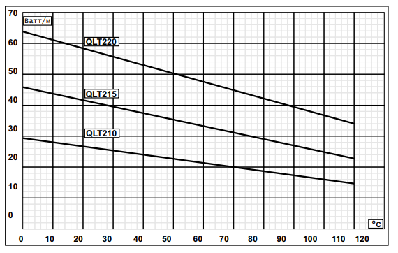 Номинальное тепловыделение в нормированных условиях для саморегулирующихся нагревательных кабелей QLT с рабочим напряжением 220В: