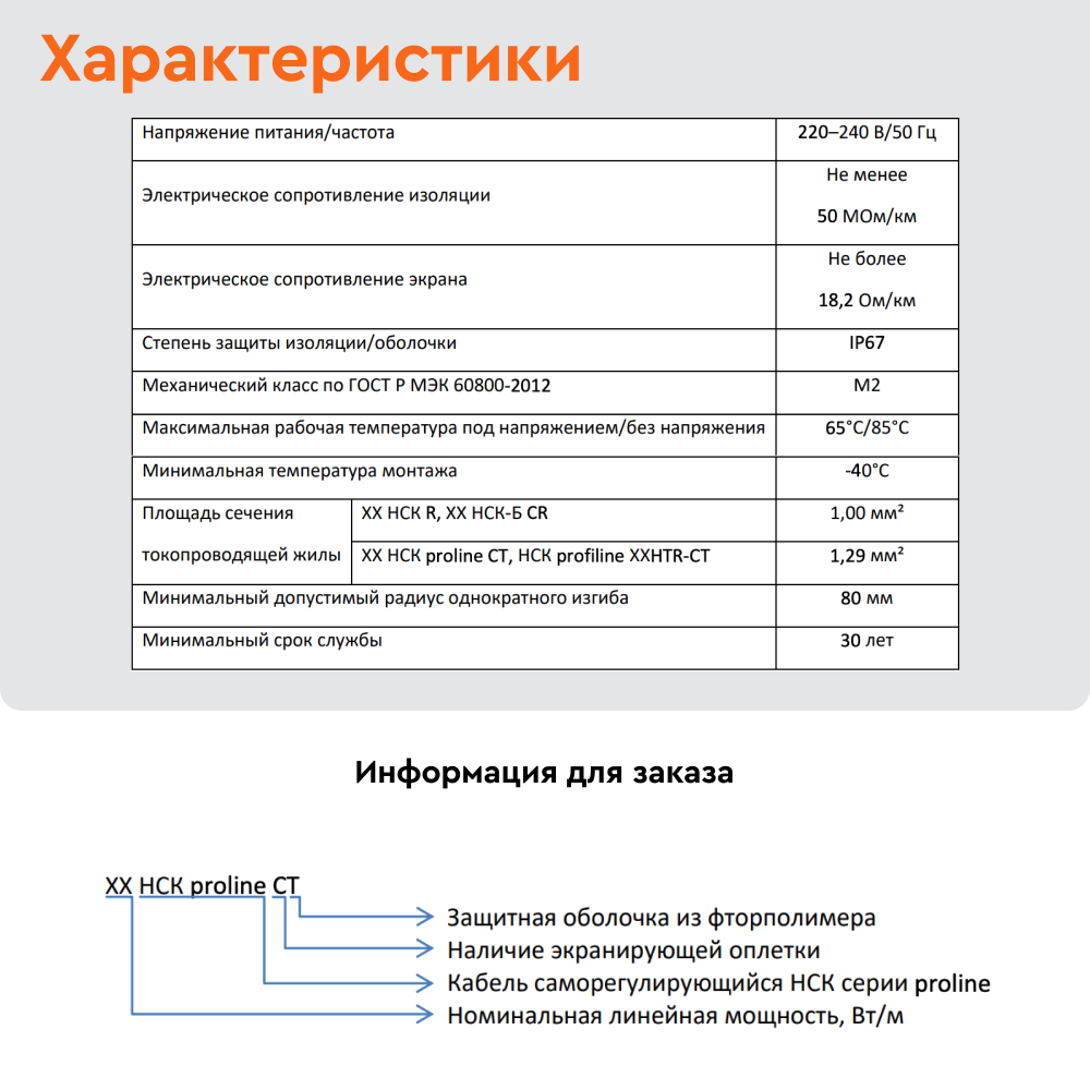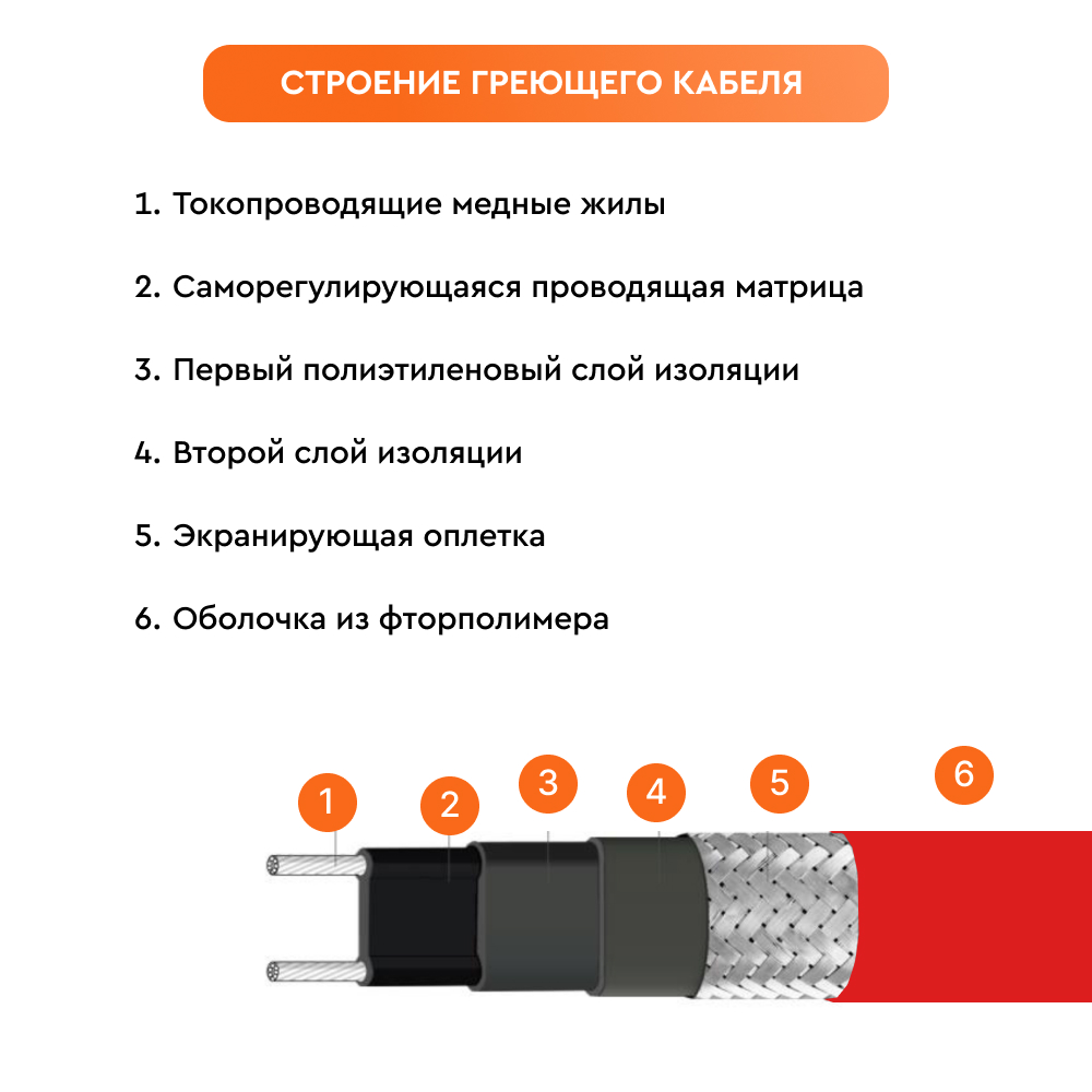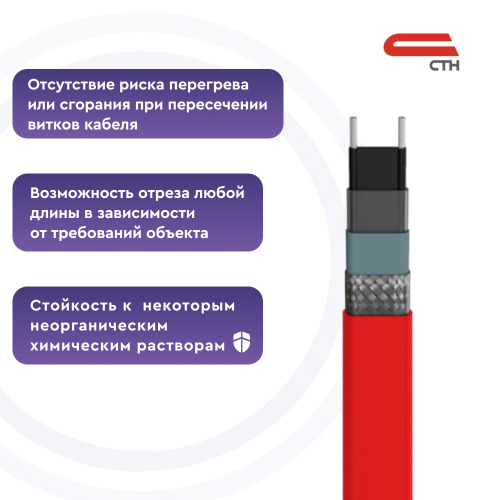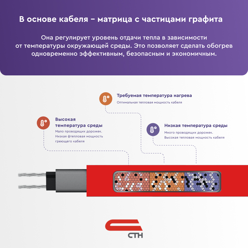 В основе саморегулирующегося нагревательного кабеля СТН 45 НСК-С-6-ТВТ лежит полупроводниковая матрица с двумя медными жилами, идущими параллельно. Нагрев кабеля происходит за счет матрицы, изменяющей свое сопротивление в зависимости от температуры среды. Это обеспечивает эффект саморегулирования: при повышении температуры сопротивление матрицы увеличивается, тепловыделение уменьшается и наоборот. Благодаря такому принципу работы, греющий кабель НСК не перегревается и не выходит из строя, даже если отдельные его участки накладываются друг на друга.