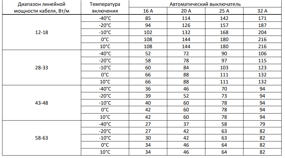 Максимальная длина (в метрах) кабеля саморегулирующегося НСК в зависимости от типа автоматического выключателя питания при 230 В: