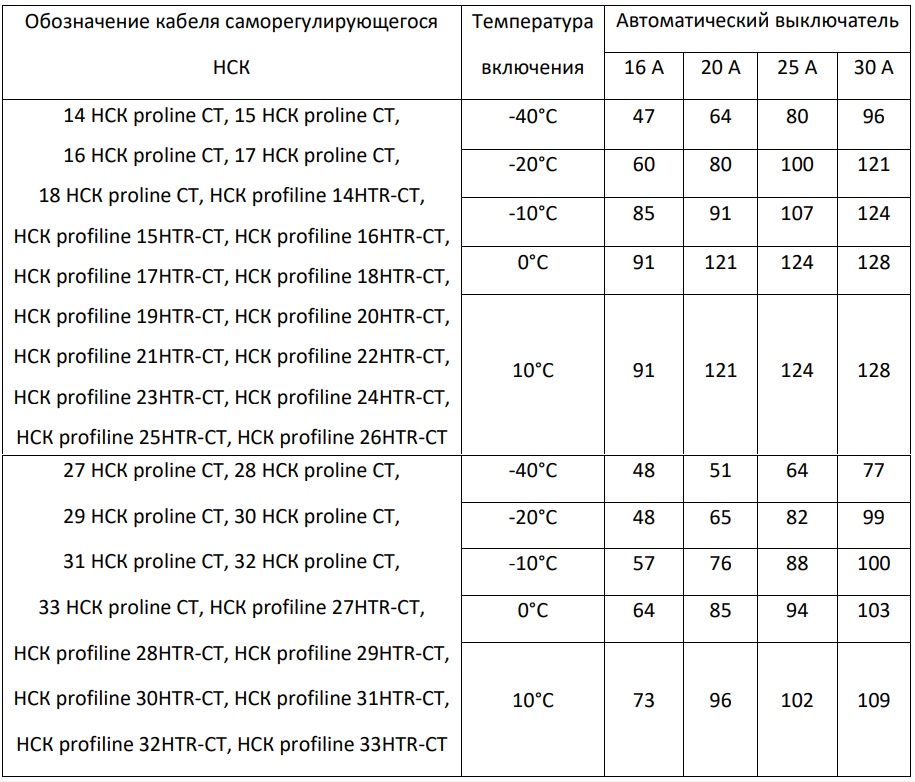 Максимальная длина (в метрах) кабеля саморегулирующегося НСК в зависимости от типа автоматического выключателя питания при 230 В: