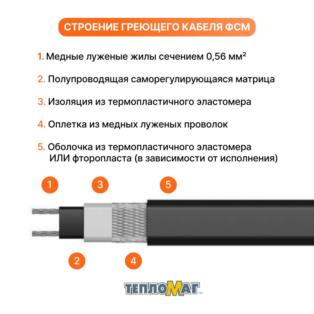 - Характеристики саморегулирования повышают безопасность и надежность кабеля. ФСМ не будет перегреваться или перегорать, даже когда его отдельные участки накладываются друг на друга. Его тепловыделение саморегулируется в ответ на изменение температуры;