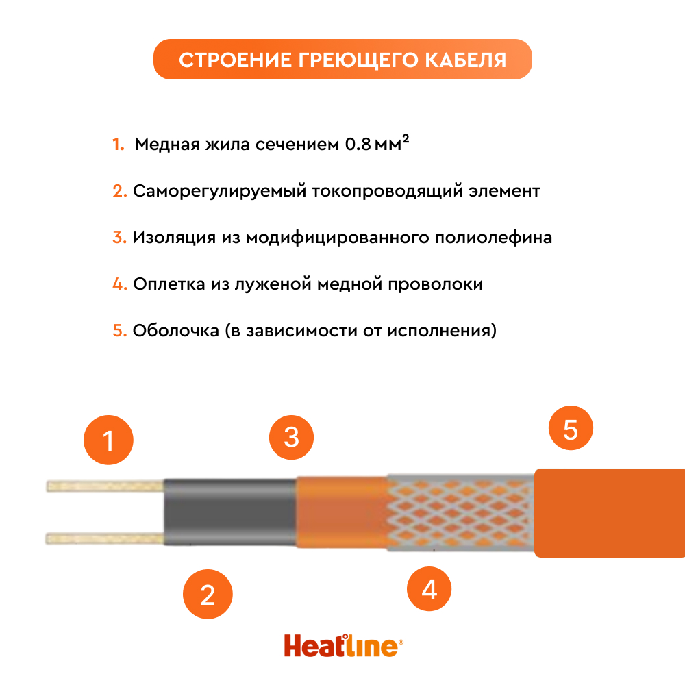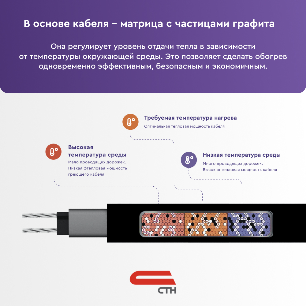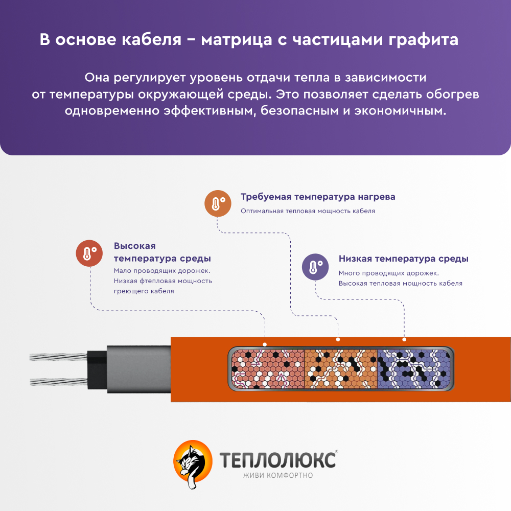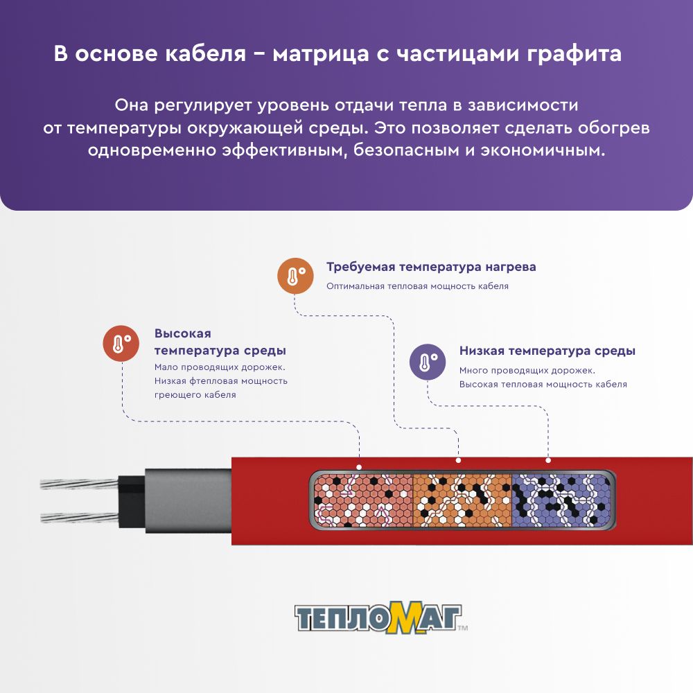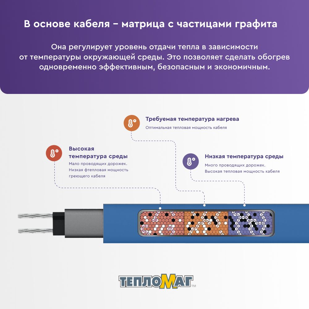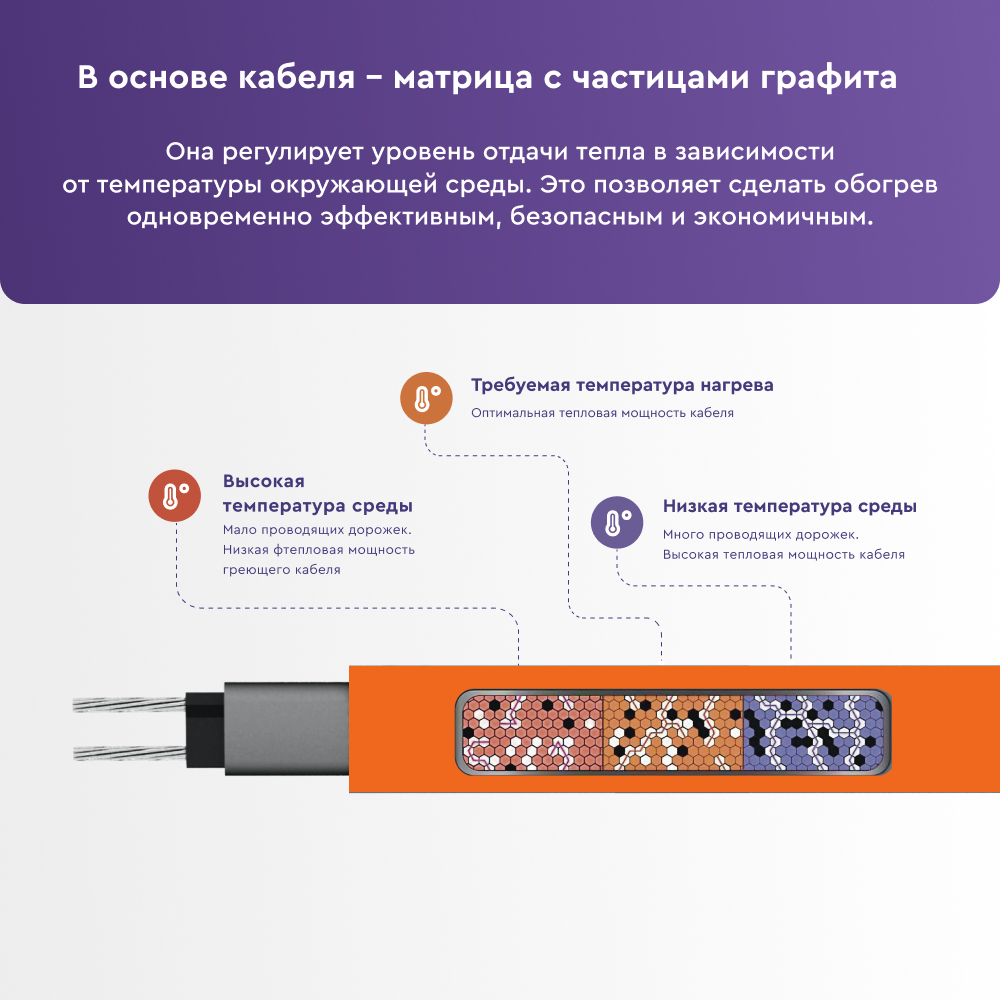 Саморегулирующиеся нагревательные кабели состоят из 2 медных жил, находящихся в токопроводящей полимерной матрице из композитного полупроводника. Сердечники находятся внутри медной оплетки с защитным покрытием, а также изоляцией. Выходная мощность на различных участках кабеля меняется, подстраиваясь под температуру окружающей среды. Таким образом, перегрев исключен на 100%, так как при достижении пороговых значений электропитание в полупроводниковой матрице почти полностью автоматически отключается, делая кабельный обогрев одновременно экономичным и безопасным для пользователя. Область применения саморегов считается самой широкой - от обогрева кровли и труб до защиты промышленных объектов от обледенения: