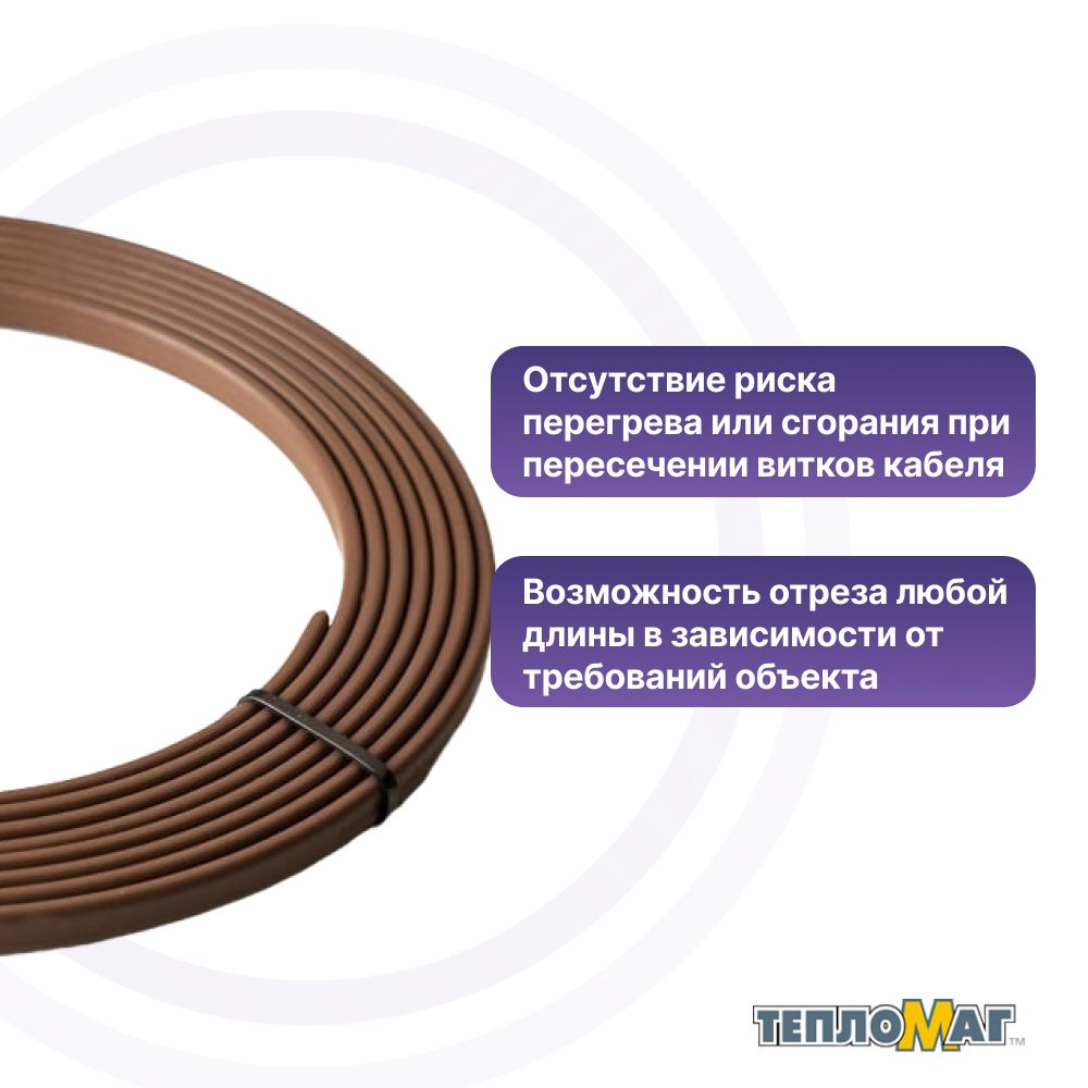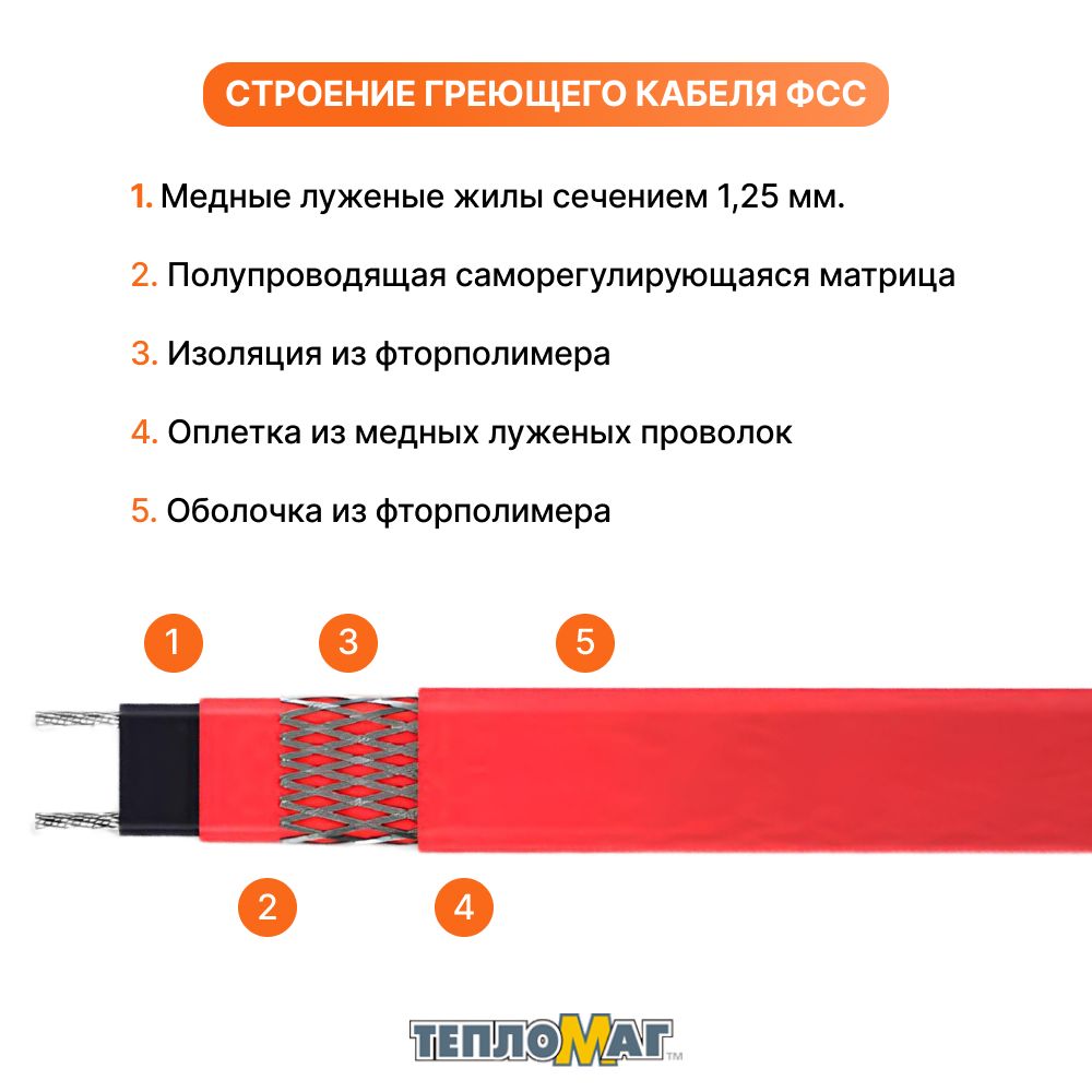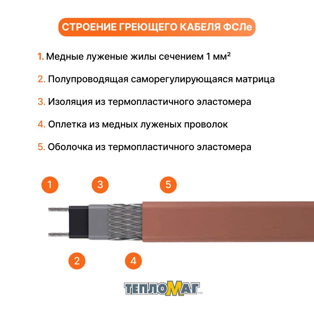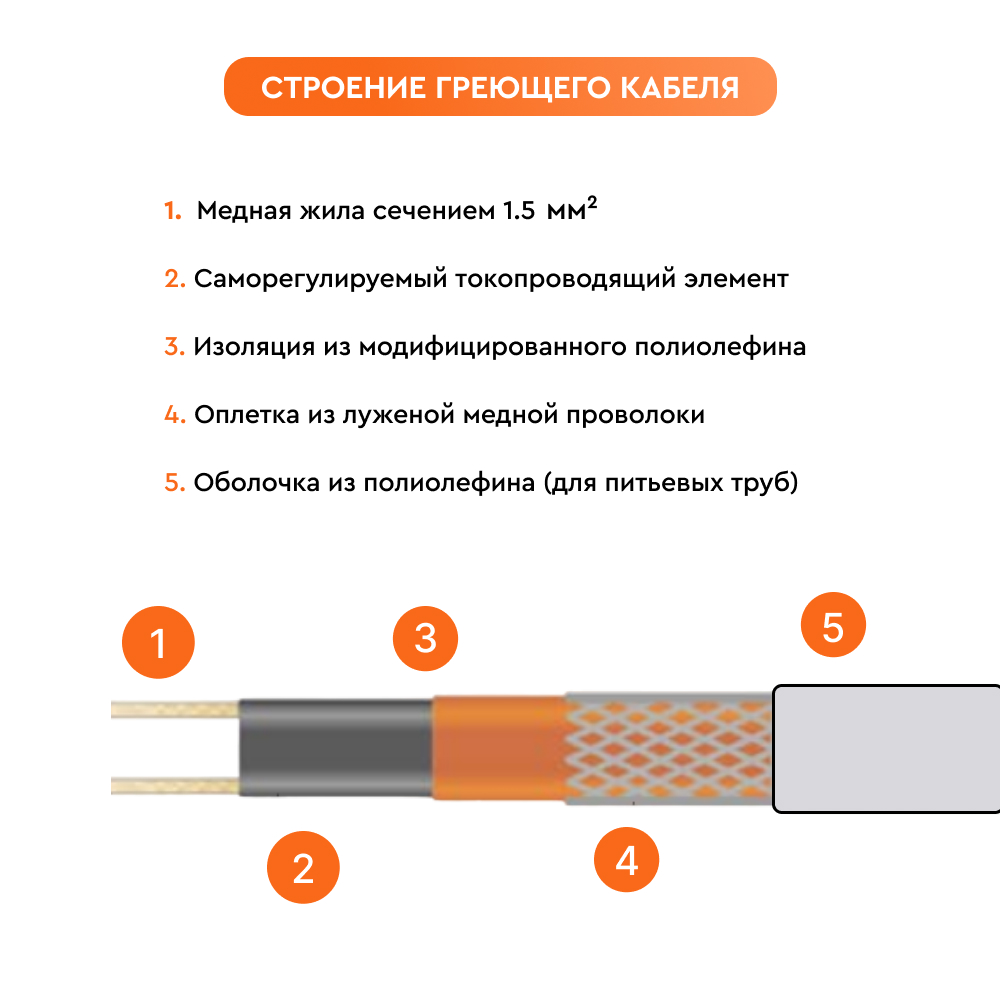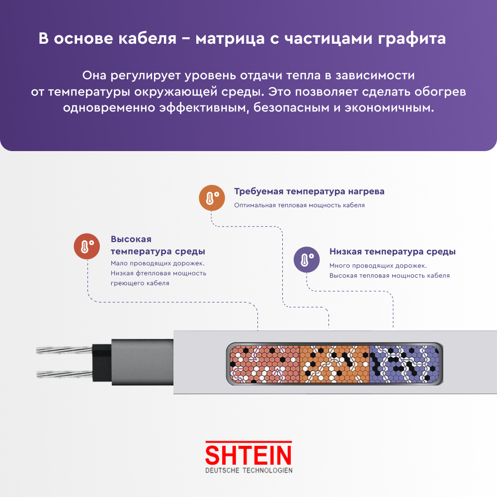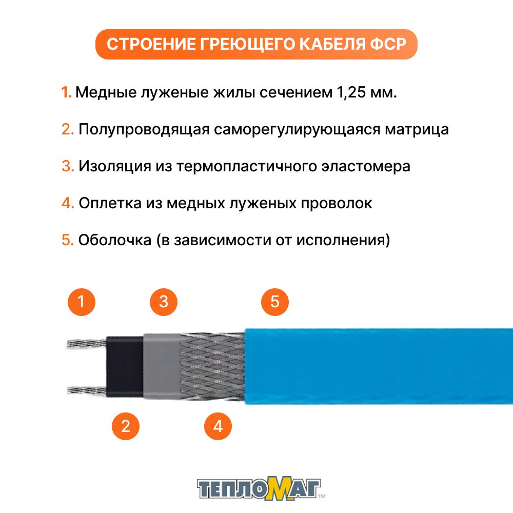 Саморегулирующиеся нагревательные кабели состоят из 2 медных жил, находящихся в токопроводящей полимерной матрице из композитного полупроводника. Сердечники находятся внутри медной оплетки с защитным покрытием, а также изоляцией. Выходная мощность на различных участках кабеля меняется, подстраиваясь под температуру окружающей среды. Таким образом, перегрев исключен на 100%, так как при достижении пороговых значений электропитание в полупроводниковой матрице почти полностью автоматически отключается, делая кабельный обогрев одновременно экономичным и безопасным для пользователя. Область применения саморегов считается самой широкой - от обогрева кровли и труб до защиты промышленных объектов от обледенения: